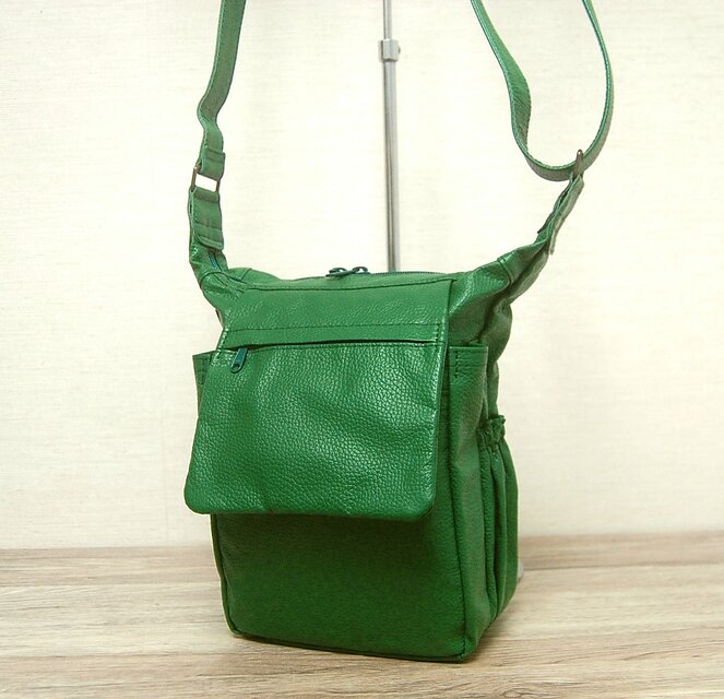 縦型の男女どちらでも持てるショルダーバッグで 小分けの収納が多く本体内部も広く箱型に作っているので安定して物が入り細かく入れ分けることも出来る形です