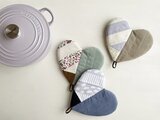 ハートにほどこしたパッチワークは、食卓やキッチンに華やぎを添えてくれます。