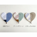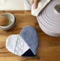 重量のあるお鍋にも対応できるようキルト生地3枚とキルト芯2枚を挟み、しっかりと厚みがありながら、掴みやすいのはハートの形だからこそ。