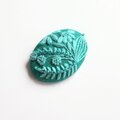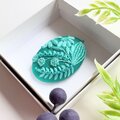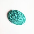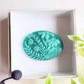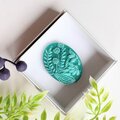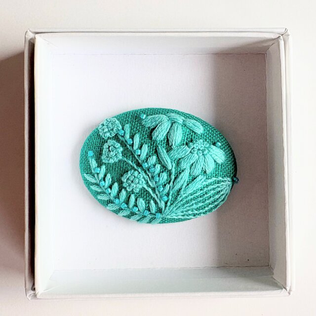 エメラルドグリーンのリネン地に小さなお花を同系色の糸で丁寧に刺繍しました。