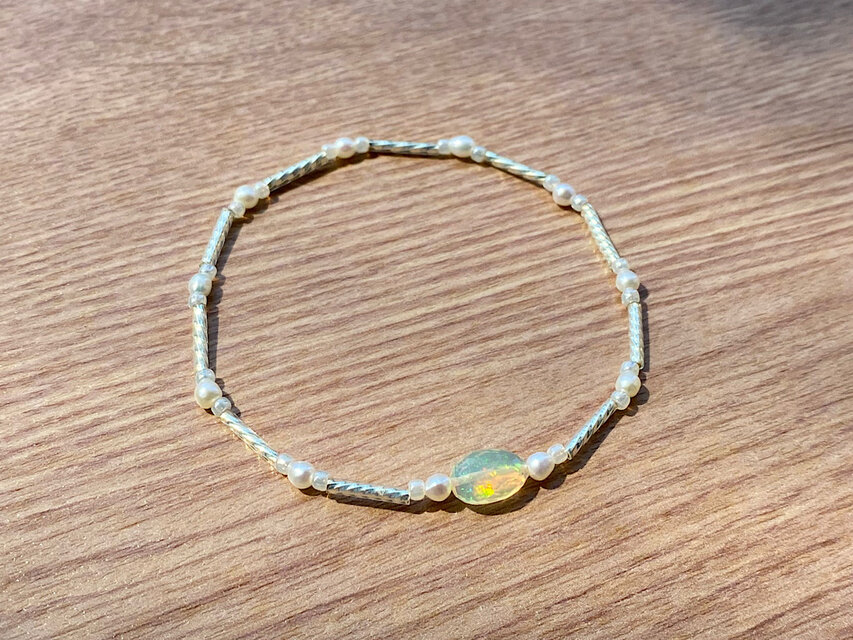 柔らかな光を纏うオパールを中心に、淡水パールとホワイトビーズを組み合わせたブレスレット。