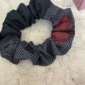 少しづつのハギレ生地を組み合わせてシュシュに仕上げました。結び目によっていろんな表情を見せてくれそう。