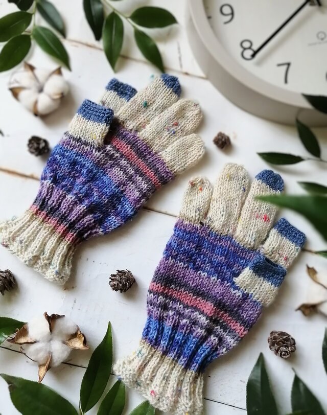 両手の親指と人さし指を短く編んであるので、外さずにスマホ操作もでき、カバンからお財布や手帳をとりだすのにもスムーズです。