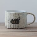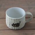 今すぐにでも飛びかかるような仕草のネコとカップの裏側にびっくりとした様子のサカナのマグカップです。