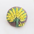 ブラウン系の綿リネン生地に可愛らしい黄色のミモザの花束をモチーフにして刺繍ブローチにしています。
