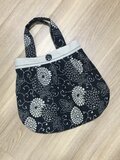 口元の切り替え生地にミシンステッチを施すことで柄生地との馴染みがよくなり可愛いバッグに仕上がりました。くるみボタンもポイントとなります。