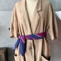 ユニセックスで楽しめるカラーとデザイン、そして程よい大判サイズで、ネックスカーフ、ネクタイ、ベルトや、ボディに巻いてビスチェとして、ウエストに巻いたりなど、現代のさまざまなシーンのファッションのアクセントとして活躍します。
