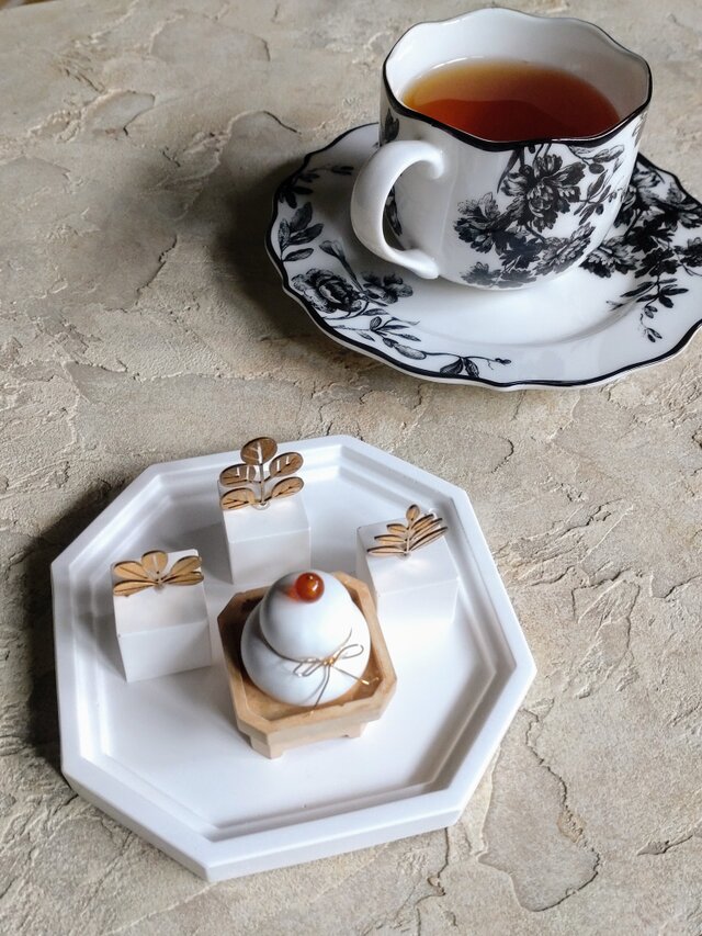 【セット販売】小さな鏡餅のアロマストーン ■ 松竹梅の揃ったお飾り 八角形のトレー
