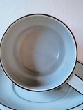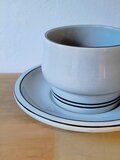 グレーがかったオフホワイトのシックな色合いに、カップの中央とソーサーの縁に施されたシャープな黒のラインが全体を引き締めます。直線的なハンドル(持ち手)も相まって、大人のモダンな雰囲気を食卓にもたらします。