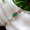 透明感があり鮮やかなエメラルドグリーンが魅力的で美しいコロンビア産のエメラルドとサイドにはミャンマー産の翡翠(ヒスイ)丸玉とガネーシュヒマール産ヒマラヤ ローズクォーツを合わせたアシンメトリーマクラメ編みブレスレットです。