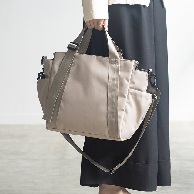 秋新作[Mサイズ]10ポケット3WAYバッグ 撥水加工ナイロン【ベージュ】軽量大容量 トート/ショルダー SDGs