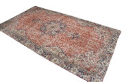 オフホワイトとコーラルレッドの優美なアラベスク模様が全体に広がり、経年変化による擦れや シャビーさも更ににヴィンテージラグの美しさが際立つ一枚