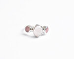 中央にはふんわりとしたミルキーピンクのローズクォーツをあしらい、両サイドに小さめのグアバクォーツを配した3石のデザイン。
