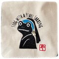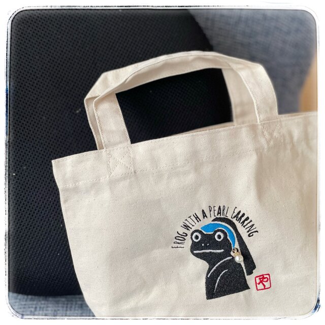 このミニトートバッグは、名画「真珠の耳飾りの少女」をユーモラスにアレンジした、カエルの刺繍が施されたユニークなデザインが魅力です。厚みのあるコットン生地に、イミテーションパールが実際にあしらわれたイヤリング部分がアクセントとなり、まるでアート作品を持ち歩いているかのような特別な一品です。