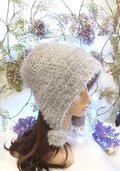 秋冬ニット帽 もふもふニットキャップ キャットヤーン ポンポン付き ライトグレー