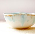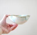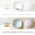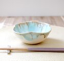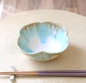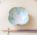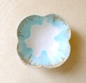 釉薬の色が冴えるきめ細やかな白陶土を使用し、艶やかな白い釉薬を全体にかけ、さらに口元に柔らかな水色の釉薬を施した四つ葉の形の小鉢です。