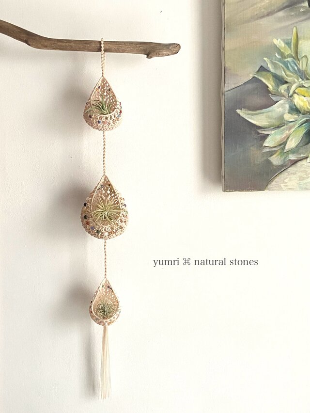 [受注制作]yumri ⌘ macrame 小さなしずく型マクラメハンギングポット3連・天然石ビーズ ライトベージュ