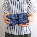 その技術を生かし、現在の日常で長く使っていただけるように素材はデニムを選び、銀泥で麻の葉紋様を金彩加工しました道中財布です。