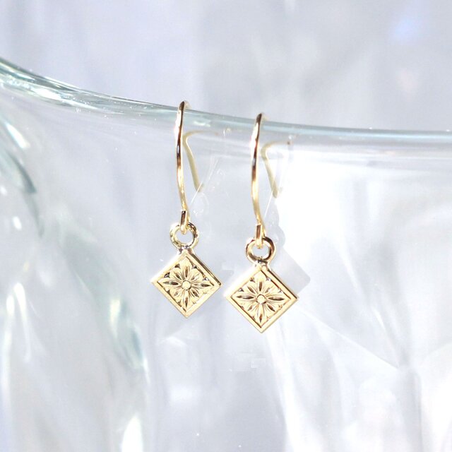 板状のK18地金に緻密なコスモスの模様を彫りこんだフックタイプのピアスです。