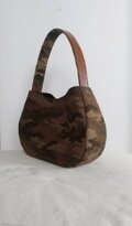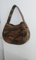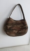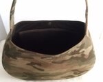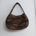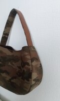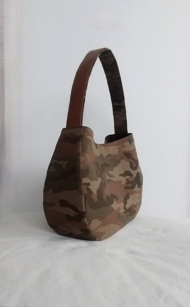 スエード調の起毛で、ヴィンテージ風な色合いが良い味を出している迷彩柄(カモフラージュ、カモフラ)を使用して、持ち手には表側に茶色のフェイクレザーx裏はカモフラを合わせた長すきず、短すぎずの使いやすい長さのワンショルダーに仕上げました。