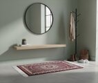 ラグ全体に広がる緻密な紋様は、ワインレッドを基調としながらも、