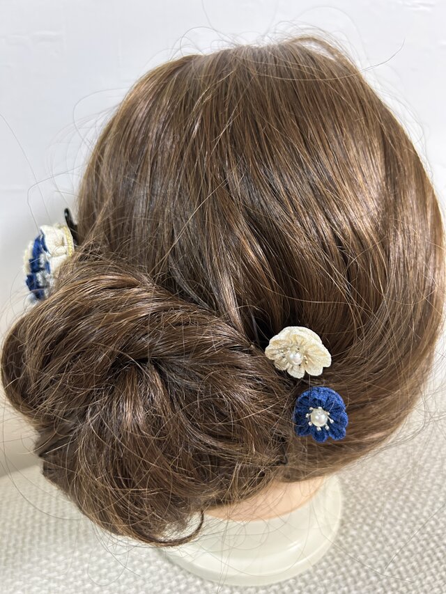 クリームと紺の小花を組み合わせた、上品で使いやすいつまみ細工のヘアピンセットです。控えめなサイズでも存在感があり、まとめ髪にそっと添えるだけで柔らかな華やかさをプラスします。和装にも洋装にも合わせやすく、普段のお出かけから特別な日まで幅広く活躍します。