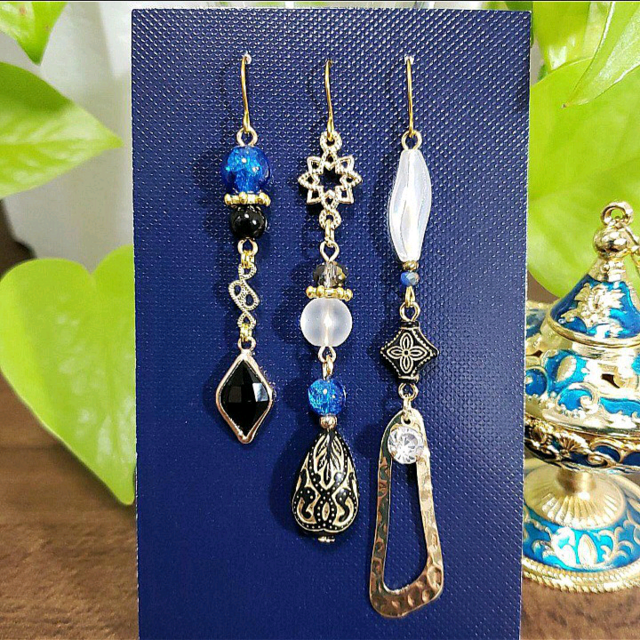 ヴィーナス★ロング エスニックデザインピアス 3つ穴 ブルー青 No.966