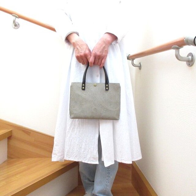 手縫い☆バッグインにもピッタリ♪《牛革》フラットミニマルトート・ペイズリー・モスグレー・0497
