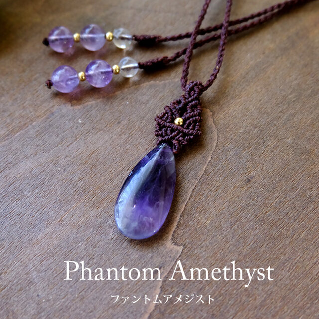 長い年月をかけ自然が生み出したクリスタルには、透明感もありファントム状の紫グラデーションが美しいと個性的なファントムアメジストを繊細に編みこんで胸元を華やかに彩る女性らしいペンダントに仕上げました。