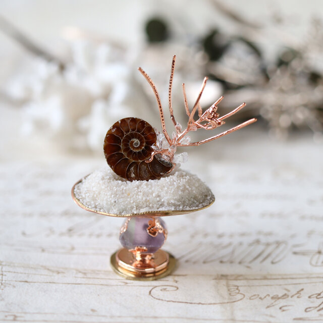 素材:アンモナイト・ムーンストーン(タンザニア産)・タネツケバナ(銅メッキ)・真鍮・フローライト