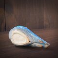 濃度の違うコバルトブルーを塗り分け素焼きし釉薬を吹きかけています。目やくちばしはゴムのり液でマスキングして後で外して細かく丁寧に仕上げます。本焼成後瞳に一点施した金液をさらに低温で焼付けるとキラリと光り、窯から出てくる時にはとても楽しそうです。