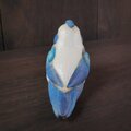 濃度の違うコバルトブルーを塗り分け素焼きし釉薬を吹きかけています。目やくちばしはゴムのり液でマスキングして後で外して細かく丁寧に仕上げます。本焼成後瞳に一点施した金液をさらに低温で焼付けるとキラリと光り、窯から出てくる時にはとても楽しそうです。