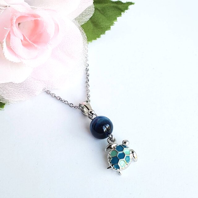 ブルータイガーアイ(ホークスアイ)と海亀のおしゃれネックレス♡