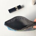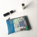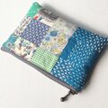 このポーチは、気に入った布を出来るだけ最後まで活用したい!という思いから制作しました。青系の絵柄や色味の布を選び、絵柄との組み合わせであまり煩くならないよう、シンプルな刺し子を施しています。
