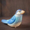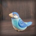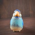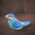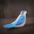 濃度の違うコバルトブルーを塗り分け素焼きし釉薬を吹きかけています。目やくちばしはゴムのり液でマスキングして後で外して細かく丁寧に仕上げます。本焼成後瞳に一点施した金液をさらに低温で焼付けるとキラリと光り、窯から出てくる時にはとても楽しそうです。