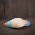 手びねりで成形しヘラでかたちを整え少し乾燥後、顔や翼を彫り込みます。細かい羽毛を線彫りするとふんわりとして見えてきます。羽の渦巻きは小さな体にみなぎる力をイメージしました。