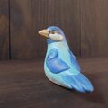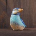 濃度の違うコバルトブルーを塗り分け素焼きし釉薬を吹きかけています。目やくちばしはゴムのり液でマスキングして後で外して細かく丁寧に仕上げます。本焼成後瞳に一点施した金液をさらに低温で焼付けるとキラリと光り、窯から出てくる時にはとても楽しそうです。