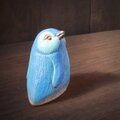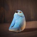 濃度の違うコバルトブルーを塗り分け素焼きし釉薬を吹きかけています。目やくちばしはゴムのり液でマスキングして後で外して細かく丁寧に仕上げます。本焼成後瞳に一点施した金液をさらに低温で焼付けるとキラリと光り、窯から出てくる時にはとても楽しそうです。