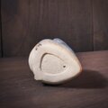 手びねりで成形しヘラでかたちを整え少し乾燥後、顔や翼を彫り込みます。細かい羽毛を線彫りするとふんわりとして見えてきます。羽の渦巻きは小さな体にみなぎる力をイメージしました。