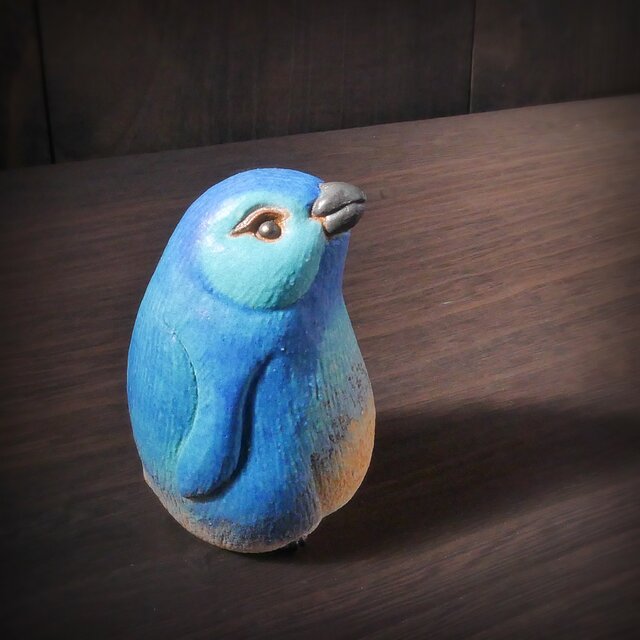 手びねりで成形しヘラでかたちを整え少し乾燥後、顔や翼を彫り込みます。細かい羽毛を線彫りするとふんわりとして見えてきます。羽の渦巻きは小さな体にみなぎる力をイメージしました。