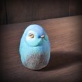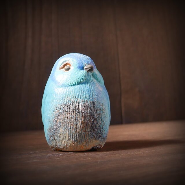 手びねりで成形しヘラでかたちを整え少し乾燥後、顔や翼を彫り込みます。細かい羽毛を線彫りするとふんわりとして見えてきます。羽の渦巻きは小さな体にみなぎる力をイメージしました。