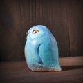 濃度の違うコバルトブルーを塗り分け素焼きし釉薬を吹きかけています。目やくちばしはゴムのり液でマスキングして後で外して細かく丁寧に仕上げます。本焼成後瞳に一点施した金液をさらに低温で焼付けるとキラリと光り、窯から出てくる時にはとても楽しそうです。