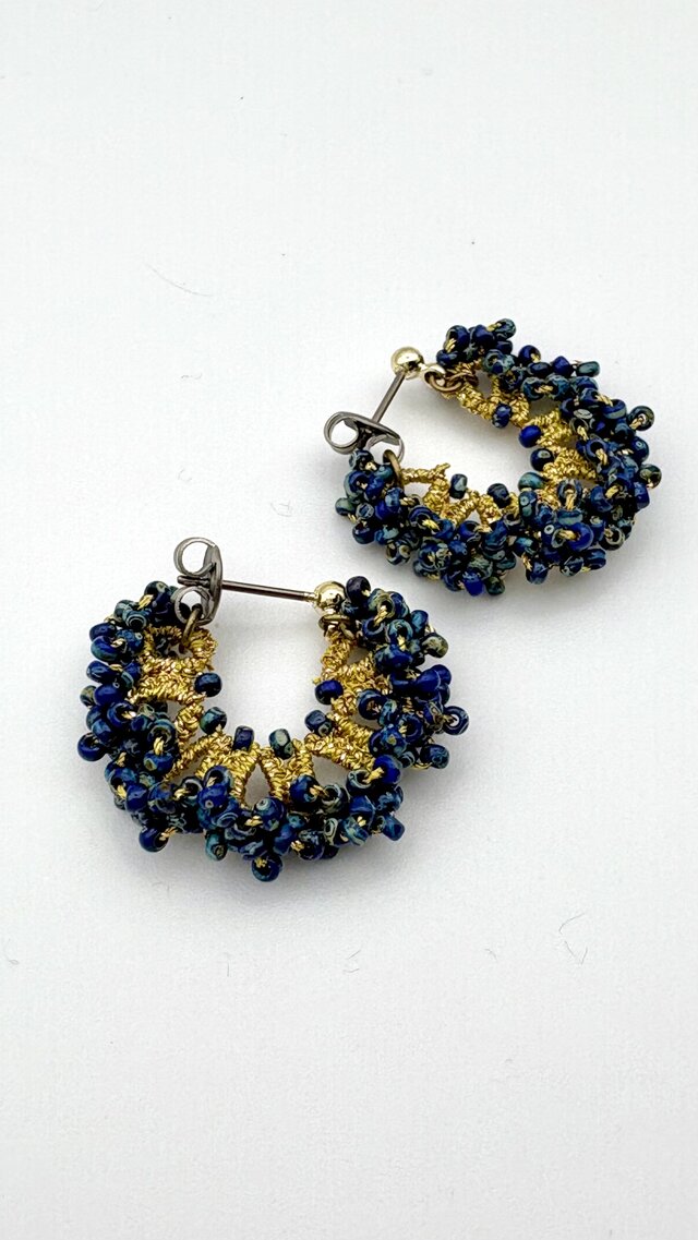 深い青の中に金の輝きが浮かぶピアスは、夜の散歩にそっと寄り添う小さな魔法