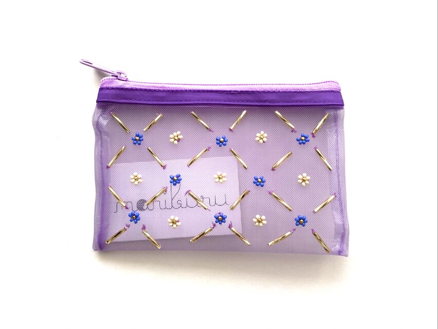 メッシュケースにアクセントにビーズでお花をあしらいました。