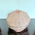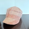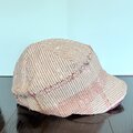 このキャップは、着物の胴裏(絹)を贅沢に使用し、甘木色と朱色の糸を経糸に手織りした布から作られています。