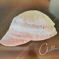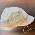 横からのシルエットです。亜麻色に少し朱が入った裂き織り地で作ったCAPです。帽子の後方の黄色の毛糸がいい味出してます。
