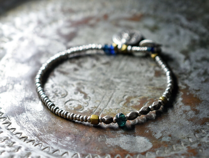 oldインドシルバーチャーム、シャン族oldシルバーとカレンシルバー、oldオリッサブラス&チンシルバー、ブルー系ビーズを繋いだブレスです。