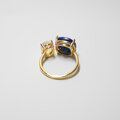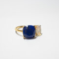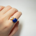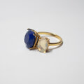 深みのある瑠璃色が印象的なアフガニスタン産ラピスラズリと、柔らかな虹色の遊色効果を見せるエチオピア産オパールを組み合わせたフォークリングです。