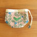 生地は綿麻のキャンバスで青いお花が咲く植物に緑の鳥さんがとまっている柄です。