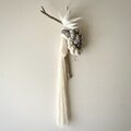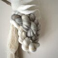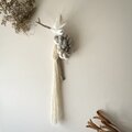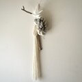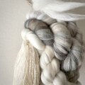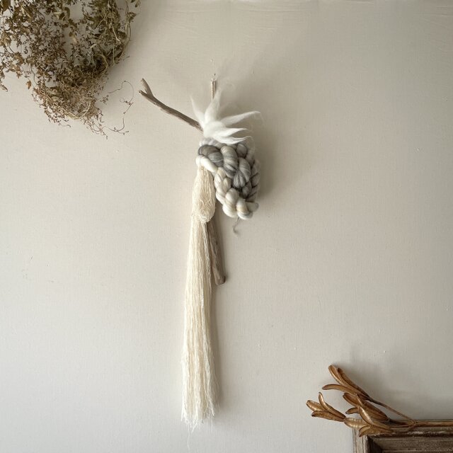 羊毛を何色も組み合わせ撚り、コットンやファンシーヤーン、流木と組み合わせました。